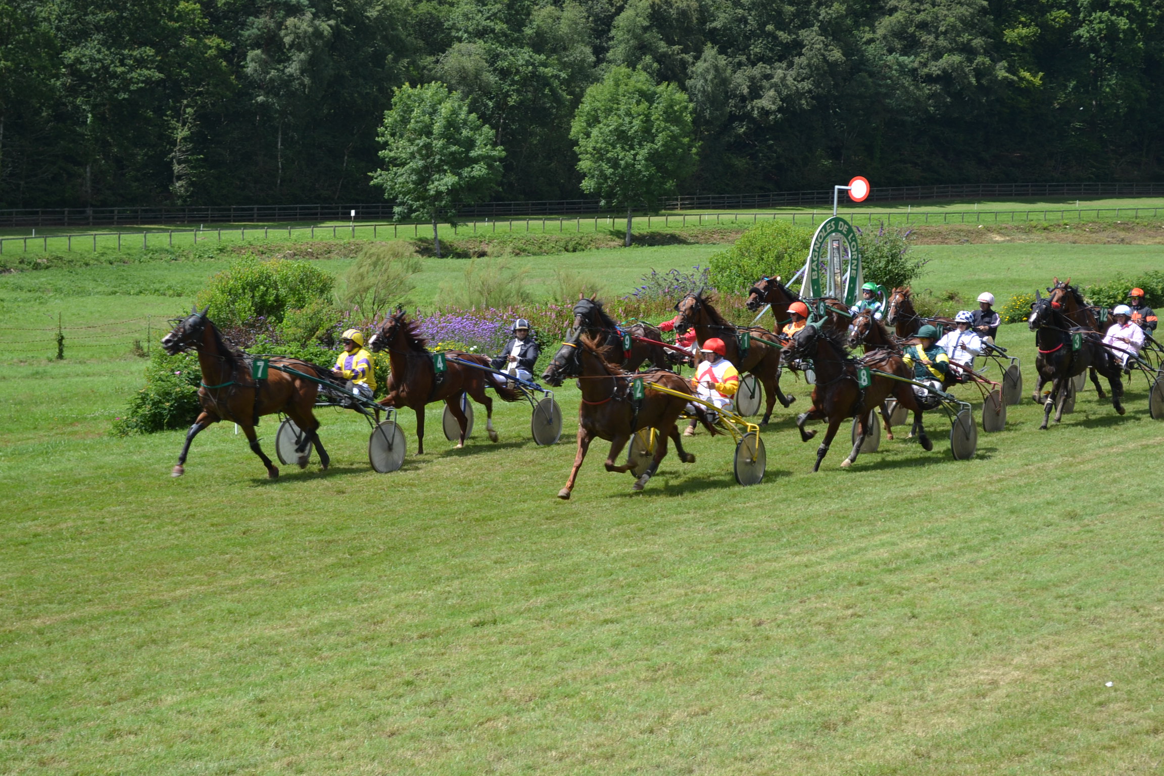 14th of July is a national holiday in France with celebrations throughout. To kick off the festivities, Bagnoles De L’Orne mowed the lawn on the local racecourse (it only happens three times a year) and rolled out the horses for a bit of trap racing …. with a bit of sunshine thrown in it definately helped the French summer holidays get off to a good start!