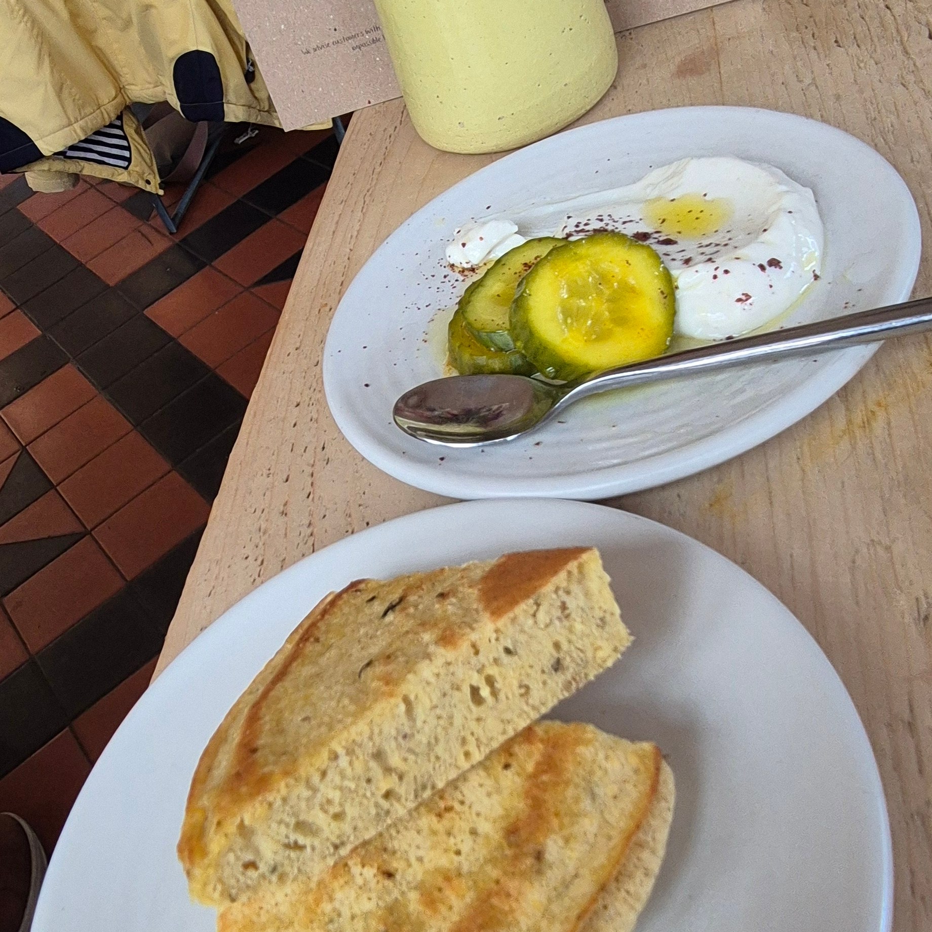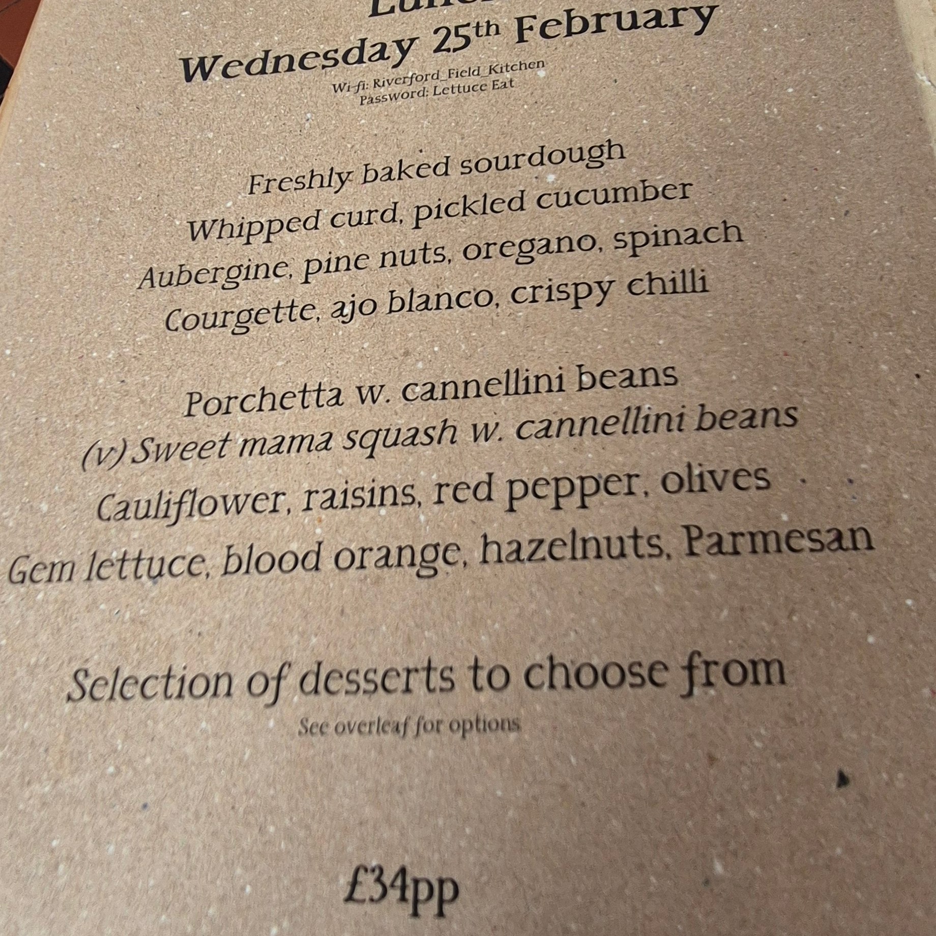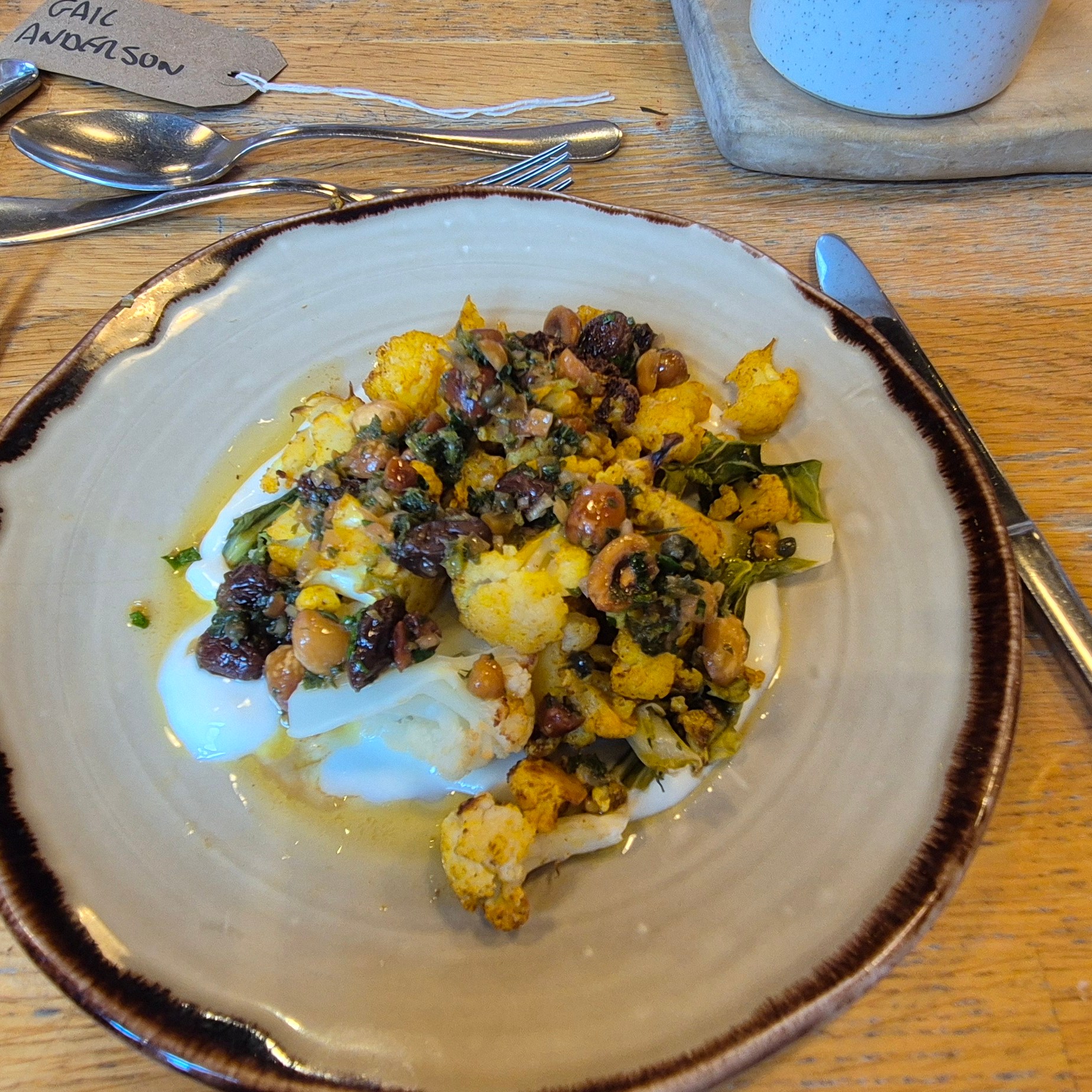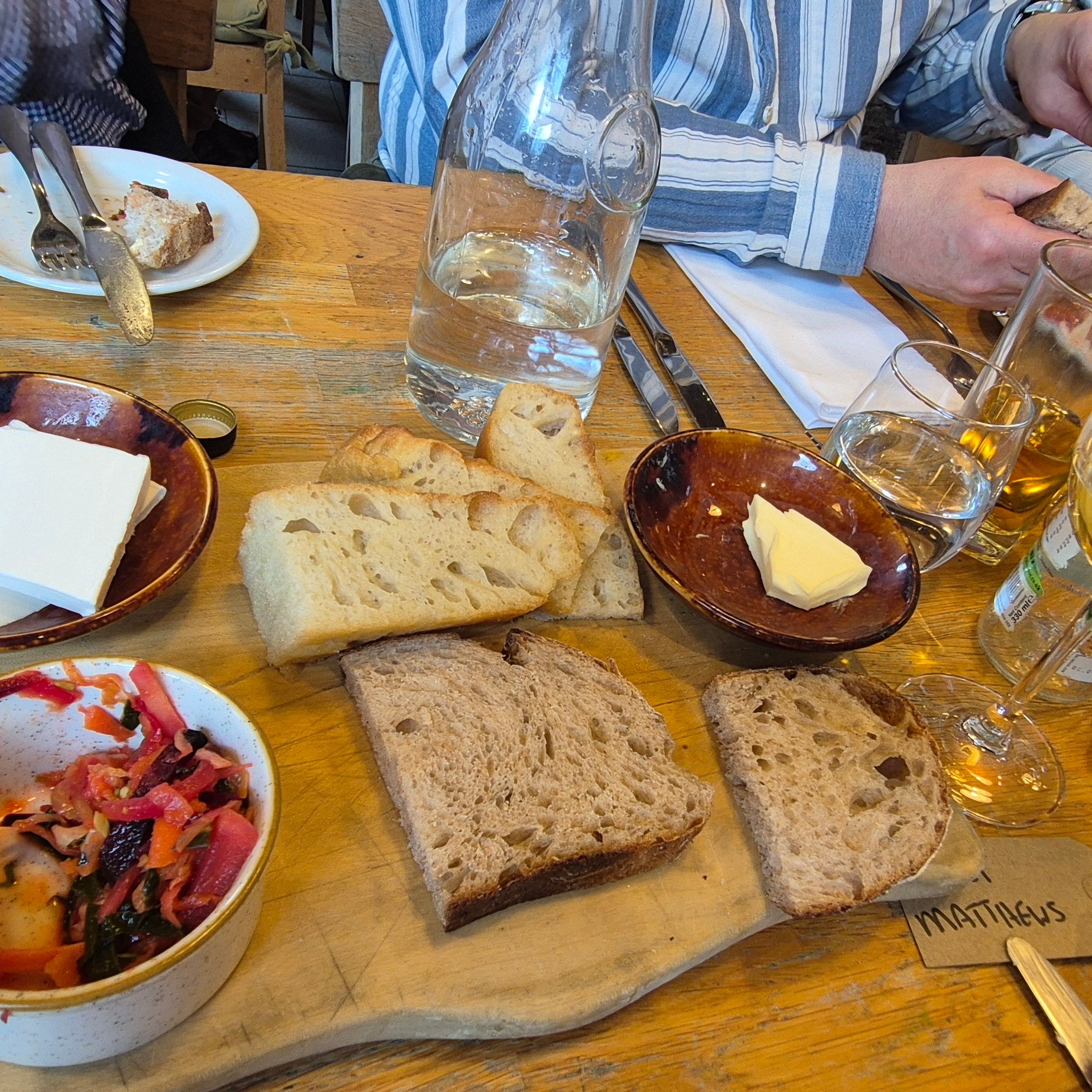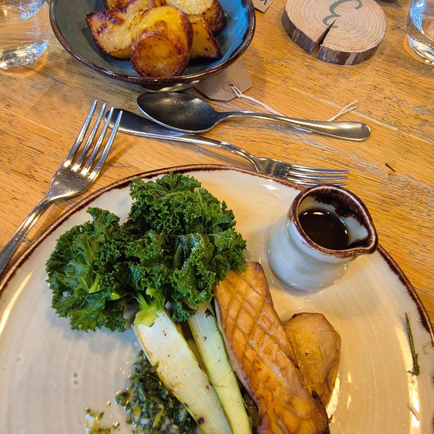 We were told to find our place names on the table and I quickly found that I was sandwiched between two lovely ladies – an 82 year old lady who had been brought out for lunch as a treat for mothers day by her son and wife – an ex-chef, and another who was with her husband, both on the cusp of fermentation and exploring local, season and fermented foods further. The concept of a shared dining experience is great, the food however, was a little disappointing – lacking in flavour and texture which is a shame, perhaps we had just set our expectations too high. Oddly, the nicest part of the meal was Keith’s lamb which came from Riverford Field Farm – Quite ironic really! Glad we came to try it but for a place that does such a large amount of fermenting – it didn’t really come through in the dishes as there was a small pot of kimchi to share on the bread board, and Keith had some Labnah (fermented yoghurt) with his starter, but that was it. Needless to say the walk over and back and the setting were beautiful, despite the weather!